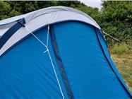 The Arpenaz 4.1 Fresh & Black is an all-in-one structure and comes with a pre-assembled bedroom and flysheet, so once this has been laid out on the ground, it's a simple process to then insert the three coloured poles into the fabric. Once these have been threaded through they need to be bent taught and positioned in the black end pieces below the flysheet. Once this has been done you need to hammer in a couple of pegs at the rear corners of the tent before you raise the frame of the tent. You then need to drive two more pegs in at the front before unravelling the guide ropes and driving anchoring these down with more pegs.