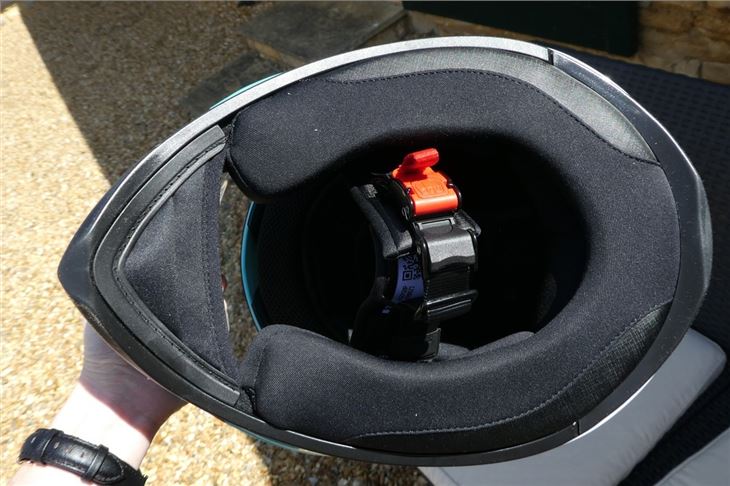 There's a micro-metric retention system, which is a strap that works like a big cable tie that you can undo. The toothed strap is not only easy to tighten and safer than a traditional 'Double D' strap, but it's also very easy to undo with your gloves still on. The K-3 SV is AGV Share Bluetooth system ready as well (with this option setting you back about £130).