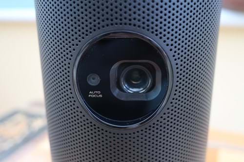 On the front of the projector, you'll find the 720p lens and a small camera that focuses the projection output - meaning it automatically adjusts the autofocus. We needed to manually adjust the focus every now and then (by holding the HDMI button down for a few seconds) but, generally, it does a very good job of doing this itself. On top of the speaker, there are a few useful buttons (directional controls, back button, volume) too.