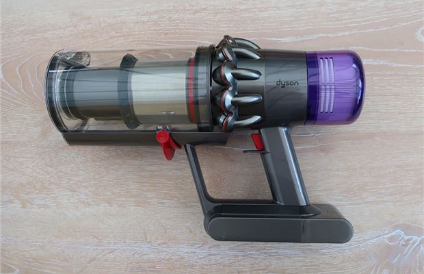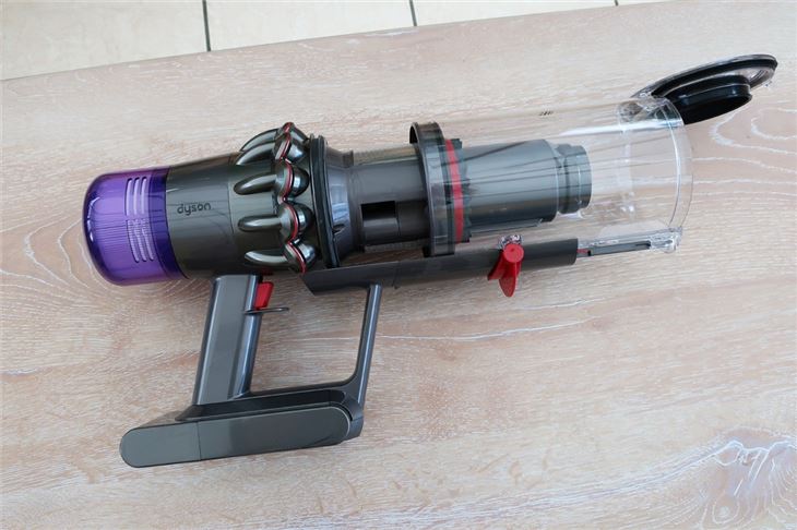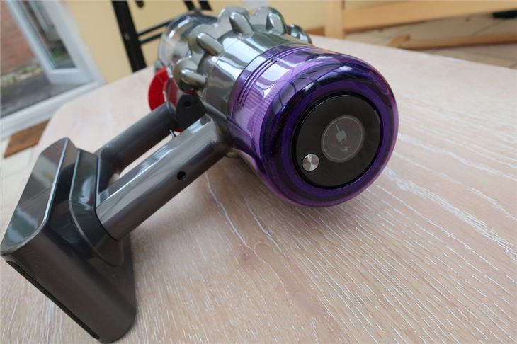 Emptying the dustbin is very simple and works exactly like the Dyson V10, with the barrel sliding forward and opening with a push of the red lever. However, we had to stick our hand into the barrel a few times to extract hairballs (ew). The bin also gets fairly dirty with things like breadcrumbs sticking to the transparent barrel, but it's large enough to not need emptying too often.