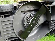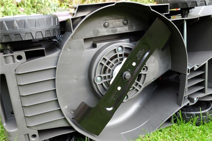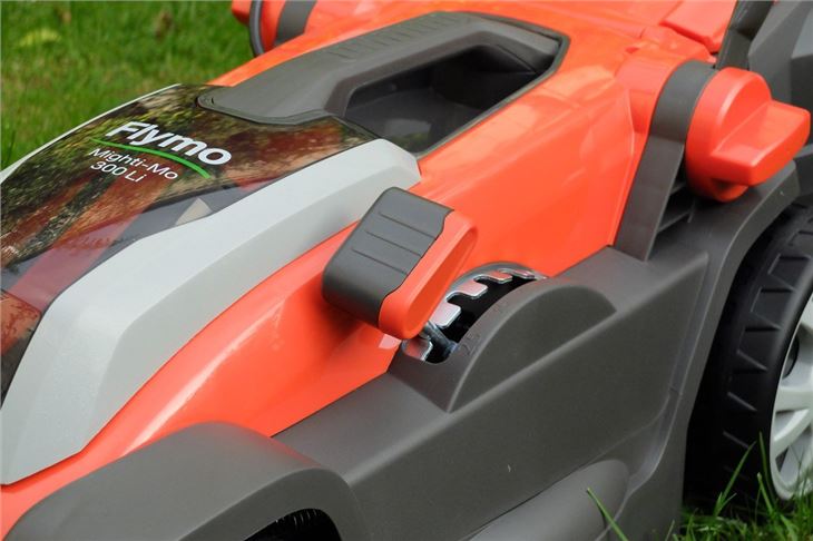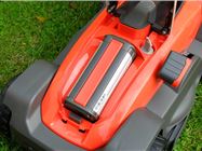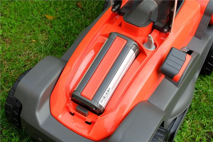 The battery slots onto the top of the mower under a smoked plastic cover but it can be a little difficult to get it to 'lock in' properly. A firm push down though and it clicks in place. There's also a 'key' of sorts, which means you can switch the power off so the mower can't be accidentally started even with the battery in. It's a useful safety feature if you have children around.