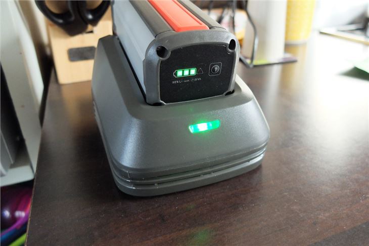 The 40-volt lithium-ion battery comes partly charged out the box and there's a handy light-up indicator on the side to show you how much power is left. It takes about two hours to fully charge the battery on the rather bulky charging unit that plugs into any three-pin socket.