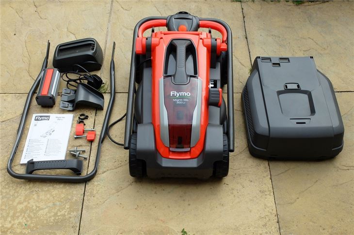 The Mighti Mo 300 Li is Flymo's only cordless mower competing with the Bosch Rotak range and similar cordless models from Ryobi and Makita. It's powered by a 40-volt lithium-ion battery which takes about two hours to fully charge and means the Mighti Mo 300 can cut a lawn of up to 250m2, equivalent to a full-size tennis court, on one charge - according to Flymo at least.