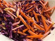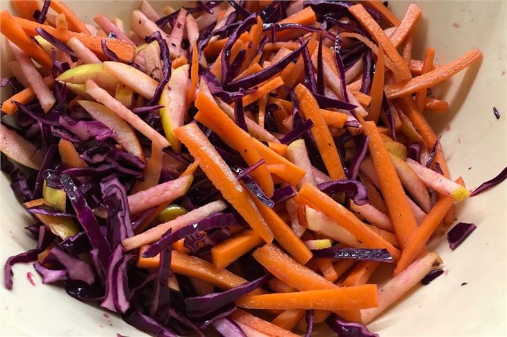 The bread rolls are made with just four main ingredients and are as easy to make as they sound. Mix everything together, knead, leave for 60 mins to prove, shape, leave for 30 mins to prove, bake. This made 12 buns. As the coleslaw is a chop and serve recipe this can be left until the last minute to make, we are changing the beetroot to apple (as we’ve made pork) mainly to save dying everything purple. Once everything is cooked we shred the pork and serve.