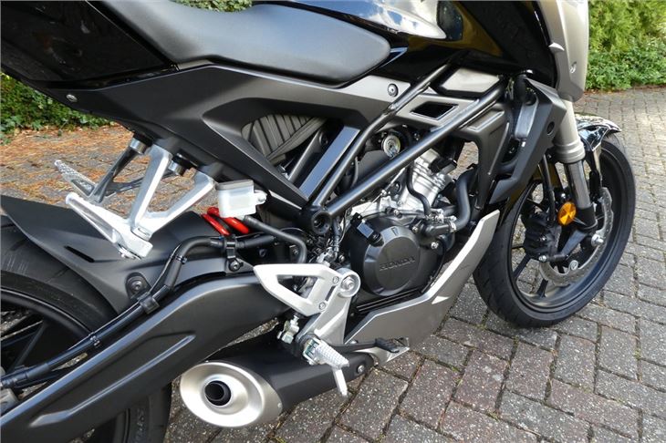 The 124.7cc SOHC 2-valve, liquid-cooled engine offers a sweet, linear power delivery up to 13PS @ 10,000rpm with the red line at 11,000rpm for a claimed 0-50mph time of 11.4 seconds. It doesn't feel particularly lacking while riding, it actually feels like it offers a decent amount of power, but it does put the CB125R a little bit behind typical 15PS 125cc rivals.