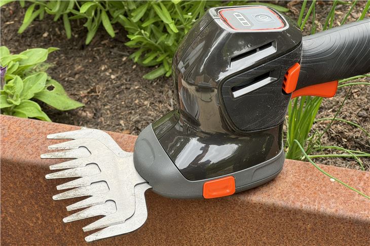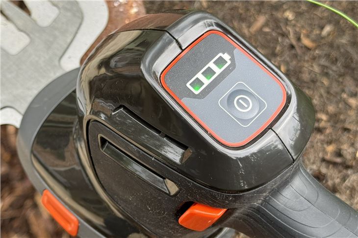 The battery slots in to place with a reassuring clunk, while there's a easy-to-read three-stage battery status indicator in easy view on the handle, so even if you're working in bright sunlight, you should easily be able to see how much juice you have left. It's then a question of which tool you want or need to work with. Which ever one you choose though, they lock onto the chassis easily, while they're easy to swap over - a quick release system requires you to press to orange buttons on the head of the shrub shear and you can take the tool off and swap it for the other one.