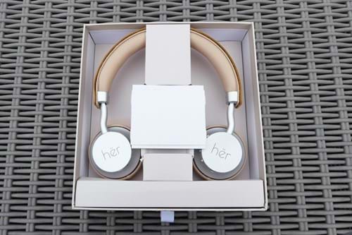 The headphones feature nude-coloured, soft leatherette ear cups, a suede headband and matte metal extenders - along with the Hër logo in various places. The entire design is very nice, and it's practical - with small details like cylindrical headband extenders, and 'left' and 'right' metallic labels being useful, as well as showing Hër's knack for unique design flourishes.