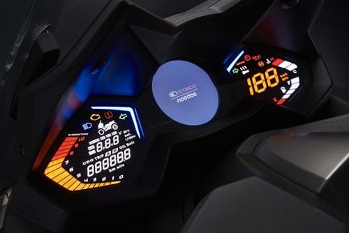 From the rider’s pew, you get to experience the huge variety of tech that’s standard on the AK550. Don’t worry if you’re not the most savvy with this stuff as Kymco’s Noodoe app is a doddle to use. Whether it’s using the Bluetooth connection to access messages, sat-nav or personalise the display screen, it’s all very straightforward. We also liked the feature that lets you keep an eye on where the bike was last parked for security’s sake. The three-screen dash also comes with a handy tyre pressure monitoring system.