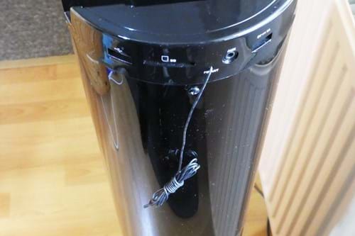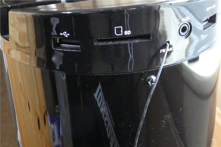 There's also a built-in FM radio with auto-scan if you don't fancy any of your own music. The radio recieves signal via a cable antenna that dangles at the back of the tower speaker, it works fine but doesn't exactly look pretty. Speaking of how it looks, the tower speaker is plastic, which isn't that surprising for this price. However, the plastic does make the Lenco feel a bit cheap, especially when we take a closer look at some of the speaker's details.