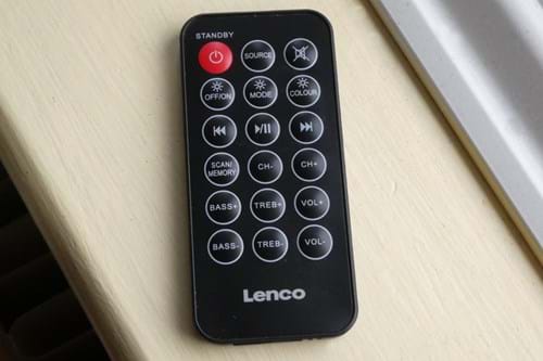 As you can see in the photos, our speaker is the black model, but the Lenco BLT-450 also comes in white. You get a small remote with the tower speaker, which can be used to turn the BTL-450 on or off, as well as to skip songs, control light modes and turn the volume up or down.