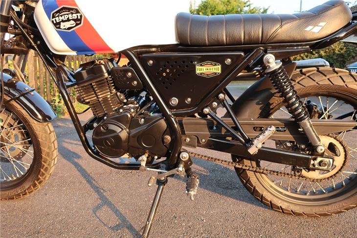 To comply with Euro 4 emissions regulations, the Tempest 125 is fitted with fuel injection. When combined with the engine, it provides 7.2Kw @ 8500 revs. It does around 90mpg and features a 13-litre tank. Thanks to the ground clearance and bash plate, it can also handle a gravel track - but we wouldn't try to take it too off-road.