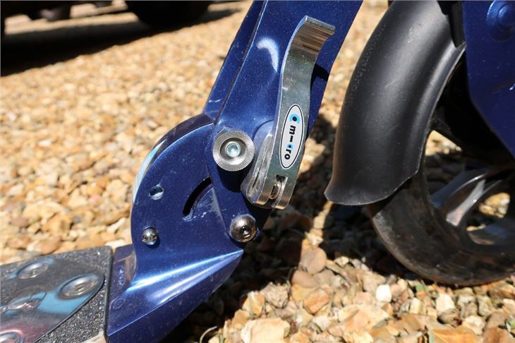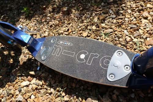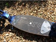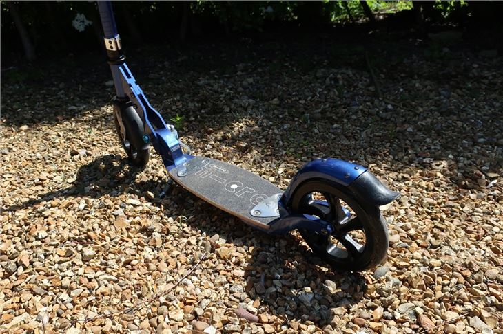 If we were to pick faults, the deck is a little bit smaller than we'd like. The idea is to have one foot flat and one foot angled to use the back-brake if necessary when you aren't pushing, but - even so, the deck feels a touch cramped. In comparison to the Micro Suspension, which has 'a larger foot deck for larger feet', the deck is considerably smaller - with enough space for one of our UK Size 5 shoes to sit flatly and our other foot to rest on the back.