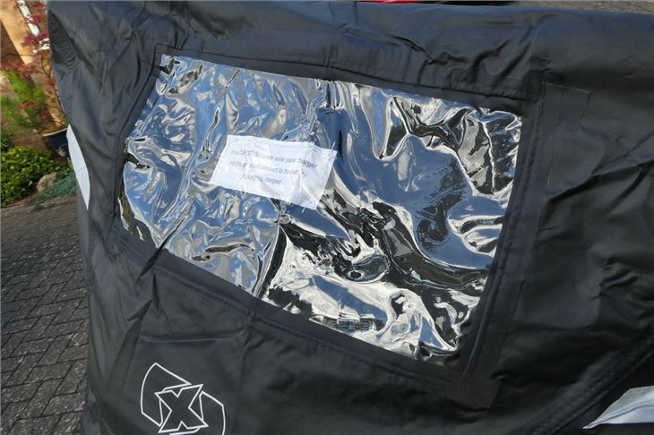 On the front pocket of the cover, you've got a transparent PVC panel that can hold a solar panel charger. There's a second rear transparent panel, which is ideal for making sure your reg plate is visible, but there's an internal 'curtain' that enables it to be covered as well.