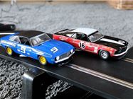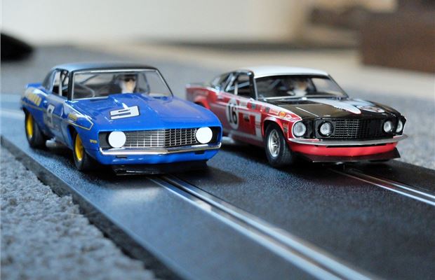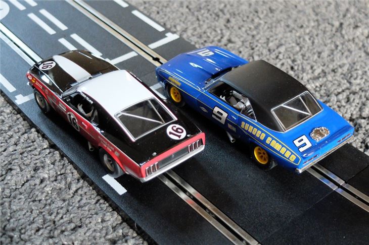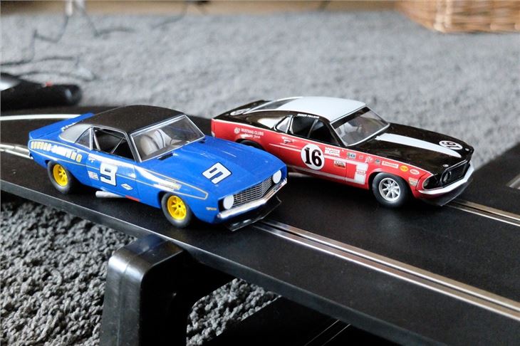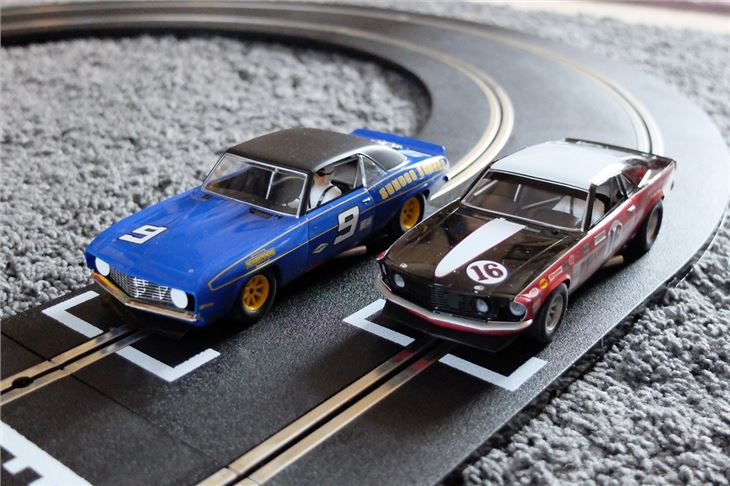 The two cars in the American Classics set — the 1969 Chevrolet Camaro and Ford Mustang Boss from the same year — are part of the Scalextric High Detail range and look superb. There's lovely attention to detail too, from the decals down the sides to the roll cages.