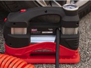 The Sealey MAC03 features a twin cylinder design that Sealey reckons improves air delivery compared to a single cylinder unit. Either way, the MAC03 has a delivery of 45lit/min and has a pressure gauge that reads up to 6 Bar/80PSI. The Ring RAC 610 Analogue goes up to 7 Bar/100PSI by comparison. This means it’s suitable for inflating tyres on cars, vans and 4x4s, but just can’t deliver the pressure for some bike tyres, so you’ll have to look elsewhere if you want an all-in-one solution.