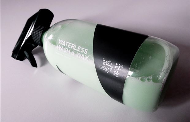 Smart Polish Pro Waterless Wash and Wax claims to clean and polish your car without the need for water. The instructions are to spray it on a microfibre cloth and work on the car one panel at a time. The product should lift away dirt and then a second cloth is used to buff the surface to a shine.