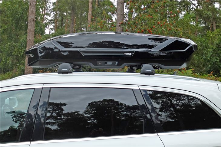 It's not too heavy at 20kg but as with any roofbox, getting it into place is easier as a two person job, especially on a big SUV like our Audi Q7. Once you've got it in exactly the right place it's easy to fit in place thanks to Thule's clever PowerClick grips. You can't overtighten them thanks to a built-in torque system which means they simply click freely if you continue to twist the dial.