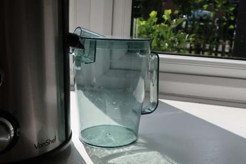 The 1100ml juice jug sits on the right side of the machine so the juice can flow into it, however, it isn't attached to the juicer so that it can be used to store and pour your homemade juice. It doesn't fit flush against the juicer, which isn't too much of an issue but it does mean that a few drops of juice sometimes leak out onto our kitchen counter if we aren't careful with the placement.