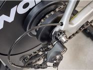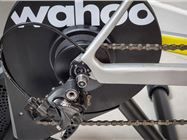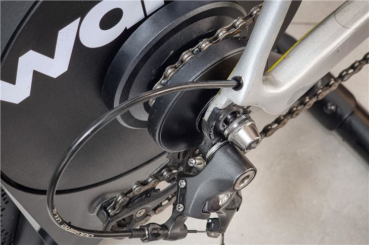 With the basics sorted, its time to mount your bike, and this is one of the biggest selling points of the Wahoo Kickr Core Zwift One as the single sprocket means its compatible with virtually any 8-12 speed bike. So whether you've got a slick 12-speed carbon disc brake road bike or an older 8 speed rim brake bike, both will fit. All you need is to swap the supplied adapters around. Mountain bikes are just as happy on the Kickr Core Zwift One, and while bikes with wheels smaller than 700C road wheels will fit, you might need to use a riser on the front wheel to avoid feeling like you're constantly descending. To make sure the bike doesn't sound like a bag of nails when you start riding, Zwift recommends moving the chain onto the small ring on the front derailleur and a middle gear on the rear to set the chain up in a nice straight line.