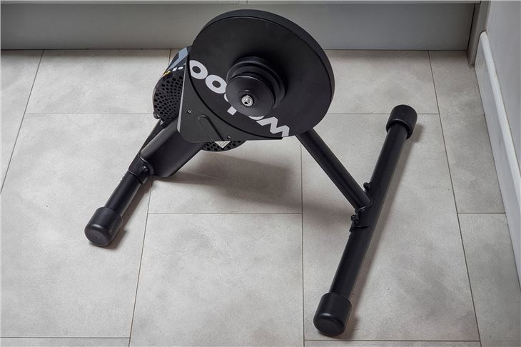 The Wahoo Kickr Core Zwift One doesn't come fully assembled - you'll need to give yourself a few minutes to bolt the horizontal feet on, but it comes with all the tools needed to set-up. There's no handle on the Wahoo Kickr Core Zwift One that you get on other trainers, so it does feel a little awkward to move about, but once you've got it in place, you're not going to need to move it around that much. When you haven't got a bike on it, the two feet do push together a little bit to take up less space, but it's not drastically different to when its extended.