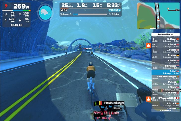 Zwift will automatically find the Wahoo Kickr Core Zwift One and all you'll need to do press one of the Zwift Click buttons to wake it up and it'll also connect. You can also connect heart rate monitor if you wish as well. Once done you can pick an activity and you're ready to ride. If you've opted for a route to follow, you just need to start turning the pedals and away you go. As the gradient increases, resistance increases making it harder to pedal, so you'll want to use the Zwift Click to change down a gear (or two) to make it a bit easier. The shifts are pretty responsive and while it doesn't have quite the mechanical feel of changing gear as you would do normally, I didn't find this a major issue for me - it complements the digital experience of riding virtually.