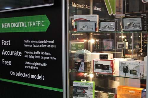 - Live traffic: Continual updates that will help the sat nav offer up the quickest, least busy route. Can also be used to redirect you around nasty jams.