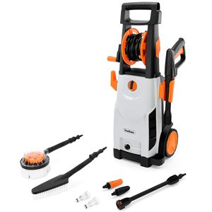 From the people who know a thing or two about hoses and water comes this 140 bar pressure washer, considerably higher than most rivals at this price bracket. That’s thanks to the aluminium 1700W motor designed for long life, and the deep rather than tall shape makes it easy to move while still providing space for the lance and two nozzles that are included in the price.