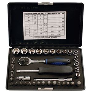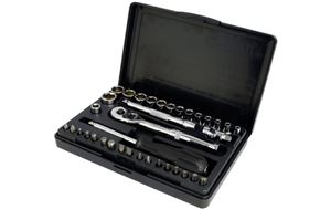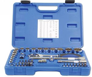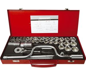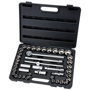 This is a heavy duty, professional grade square-drive socket and combination wrench set. It comes with 23 ½in square drive sockets (10-32mm), a ½in square drive pear head ratchet, two extension bars (125 and 250mm), universal joint and 13 combination wrenches (7-19mm). Supplied in a touch plastic case, at 69.99 it's great value.